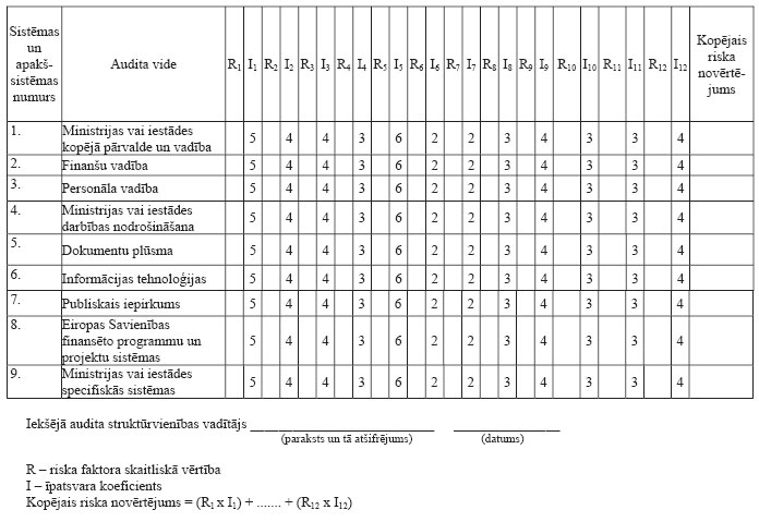 25. Katras iekšējā audita vidē iekļautās sistēmas kopējo riska novērtējumu nosaka, saskaitot katra riska faktora skaitliskās vērtības un īpatsvara koeficienta reizinājumu (1.pielikums).