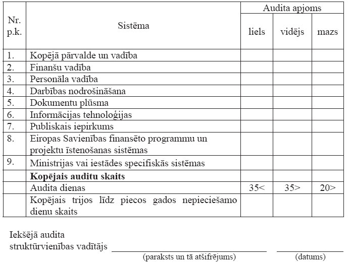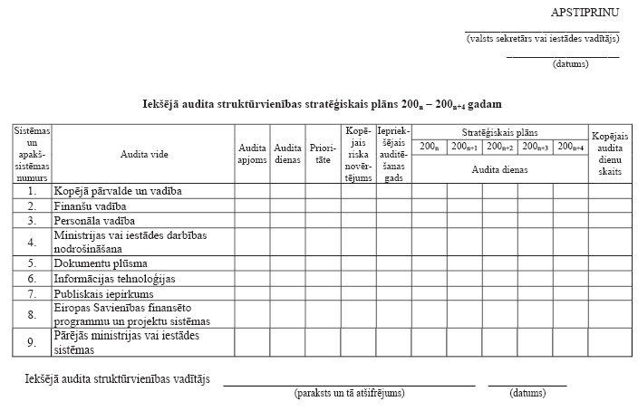 30. Izstrādājot stratēģisko plānu, iekšējā audita struktūrvienības vadītājs pieņem lēmumu par auditu biežumu un audita veikšanai nepieciešamo dienu skaitu saskaņā ar riska novērtējumu, esošajiem iekšējā audita struktūrvienības resursiem, iekšējo auditoru darba iemaņām un pieredzi, kā arī ņemot vērā attiecīgās ministrijas vai iestādes specifiku.