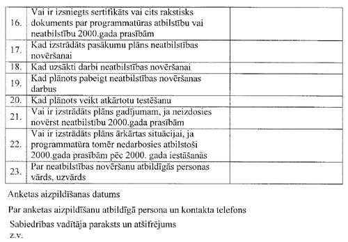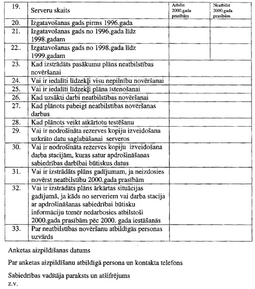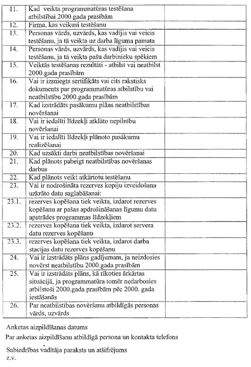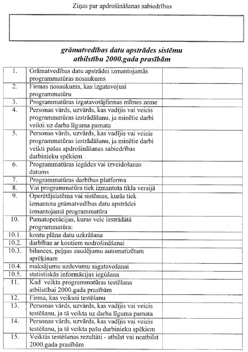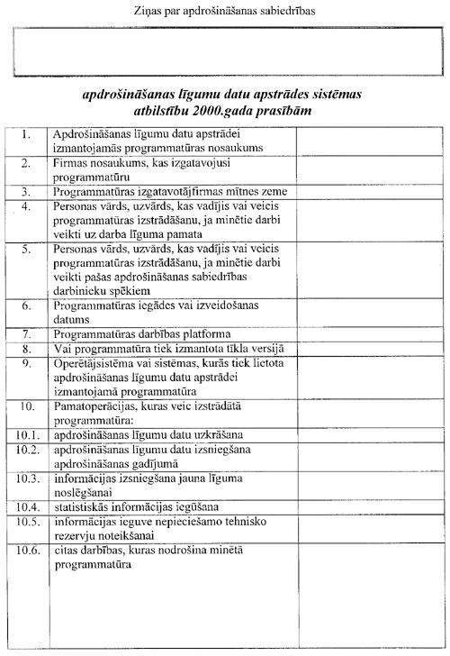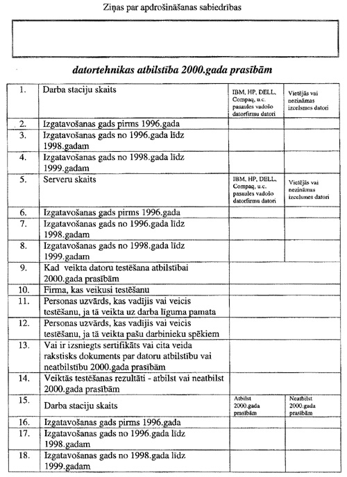 Lai novērtētu 2000.gada datorproblēmas riska ietekmi uz apdrošinātāju darbību noteikt, ka apdrošinātāji līdz 1999.gada 10.oktobrim iesniedz Apdrošināšanas uzraudzības inspekcijā informāciju par 2000.gada datorproblēmas riska risināšanu pēc tabulās dotā parauga (1.,2.,3.,4. un 5. pielikums).