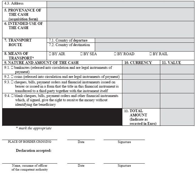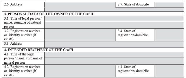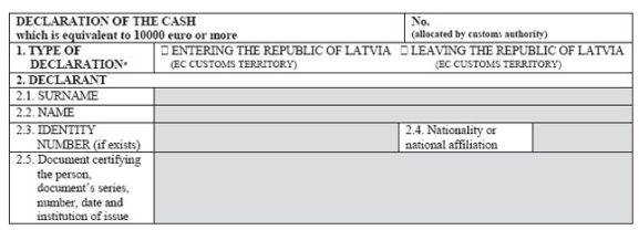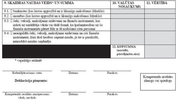 3. Deklarācijas veidlapas (uz paškopējoša papīra) latviešu, angļu un krievu valodā ir bez maksas pieejamas kompetentajā iestādē valsts robežas šķērsošanas vietā.