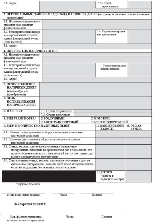2. Fiziskā persona, kurai atbilstoši Eiropas Parlamenta un Padomes 2005.gada 26.oktobra Regulai (EK) Nr.1889/2005 par skaidras naudas kontroli, kuru ieved Kopienas teritorijā vai izved no tās, ir pienākums deklarēt skaidru naudu, aizpilda deklarāciju (pielikums) (divos eksemplāros, uz paškopējoša papīra) un iesniedz to kompetentās iestādes pilnvarotajai amatpersonai valsts robežas šķērsošanas vietā.