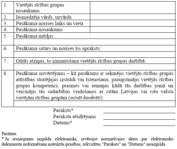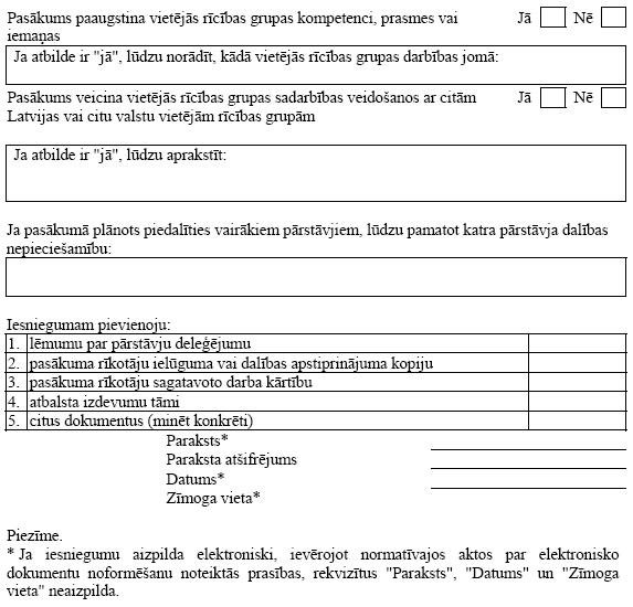 8. Vietējā rīcības grupa iesniedz ministrijā iesniegumu ne vēlāk kā 15 darbdienas pirms pasākuma norises.