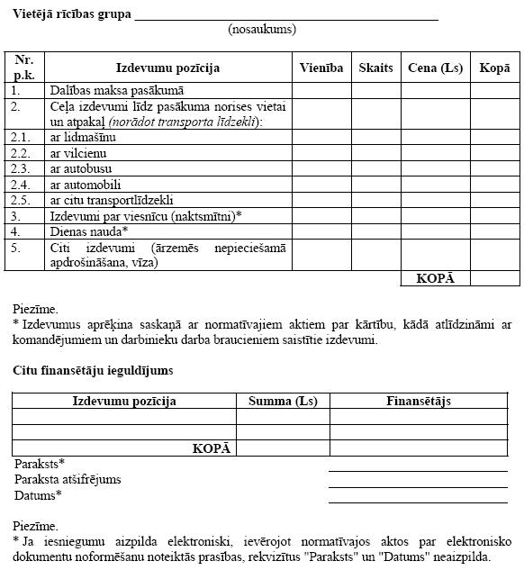 7.4. atbalsta izdevumu tāmi, kurā iekļauj dalības maksas apmēru pasākumā, dienas naudas apmēru, izdevumu apmēru par viesnīcu, ceļa izdevumu apmēru (transporta biļetes, degviela, ārzemēs nepieciešamā apdrošināšana, vīza) (2.pielikums). Izdevumus aprēķina saskaņā ar normatīvajiem aktiem par kārtību, kādā atlīdzināmi ar komandējumiem un darbinieku darba braucieniem saistītie izdevumi. Izdevumu tāmē norāda arī pasākuma rīkotāju, pārstāvja un citu finansētāju ieguldījumu.