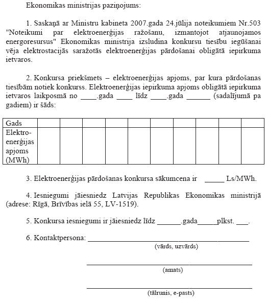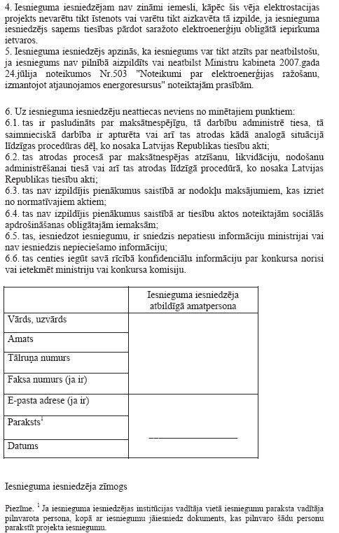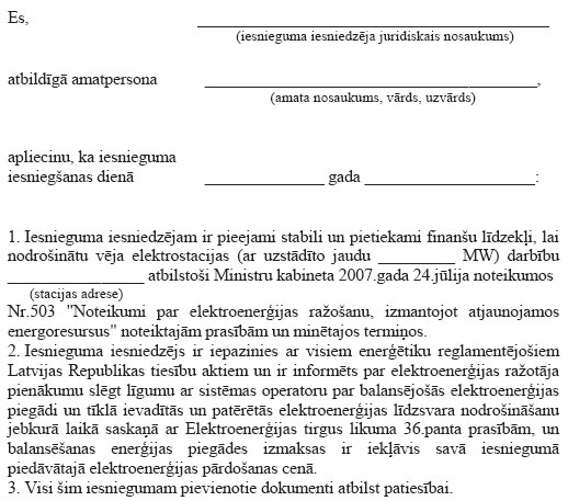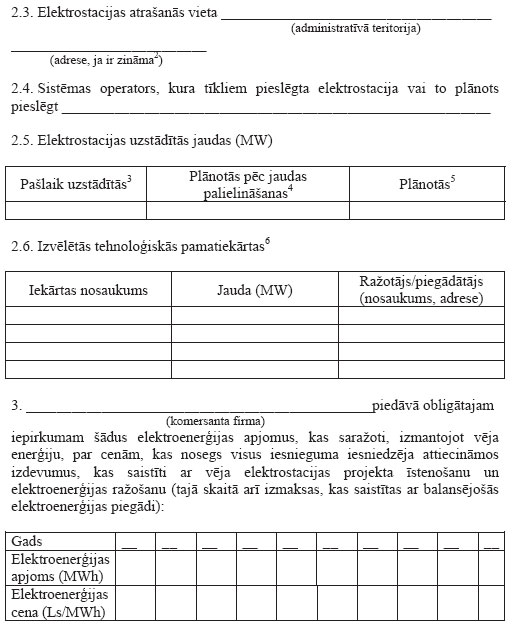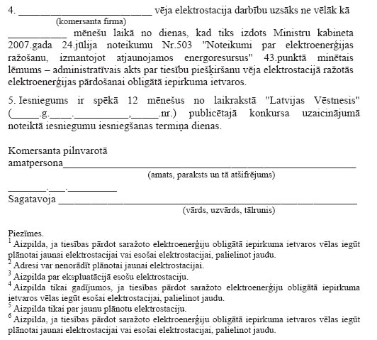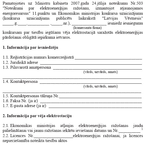 Iesniegums konkursam par tiesību iegūšanu vēja elektrostacijā saražotās elektroenerģijas pārdošanai obligātā iepirkuma ietvaros