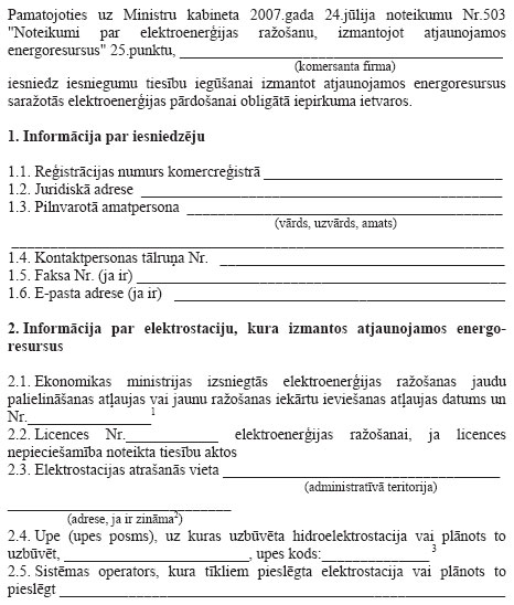 Iesniegums tiesību iegūšanai izmantot atjaunojamos energoresursus saražotās elektroenerģijas pārdošanai obligātā iepirkuma ietvaros