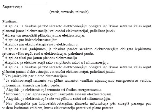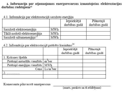 12. Iesniegumā komersants norāda no atjaunojamiem energoresursiem saražotās elektroenerģijas apjomu, kādu tas katru gadu 10 gadu periodā ir gatavs pārdot publiskajam tirgotājam, un elektroenerģijas cenu, par kādu tas katru gadu minēto elektroenerģijas apjomu ir gatavs pārdot. Iesniegumā norāda ministrijas izsniegto elektroenerģijas ražošanas jaudu palielināšanas vai jaunu ražošanas iekārtu ieviešanas atļauju numurus, izsniegšanas datumus un derīguma termiņus.