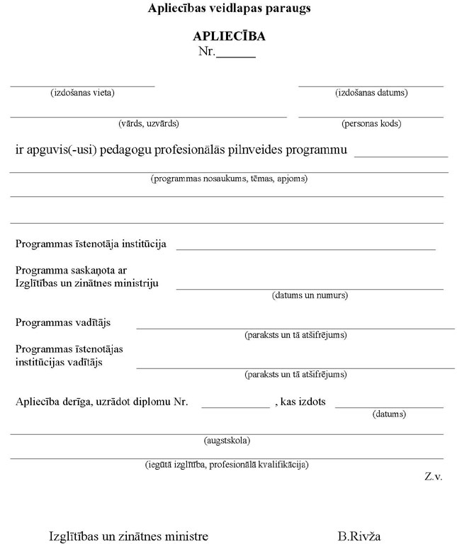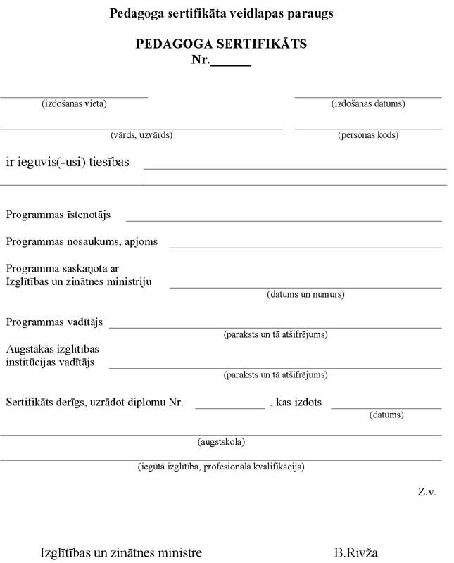 15. Pēc B programmas apguves tās īstenotājs izsniedz pedagogam profesionālo pilnveidi apliecinošu dokumentu – pedagoga sertifikātu (2.pielikums). Sertifikātu paraksta programmas vadītājs un augstākās izglītības institūcijas vadītājs.