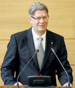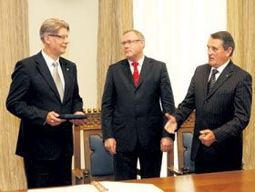 Vakar, 28.augustā, pēc vasaras pārtraukuma, sanāca Rīgas domes pirmā sēde, ko atklāja Valsts prezidents Valdis Zatlers. Iepriekš starp Valsts prezidentu (attēlā pa kreisi) un domes vadītājiem – mēru Jāni Birku (centrā) un vicemēru Andri Ārgali (pa labi) – izvērtās savstarpēji ieinteresēta saruna par galvaspilsētas akūtākajām problēmām, tās sakārtotību, visu iedzīvotāju labklājību un komfortu Foto: Boriss Koļesņikovs, “LV” |