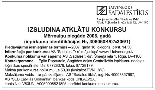 Piegādes un darbu izpildes pasūtījumi. Publicēts oficiālajā laikrakstā "Latvijas Vēstnesis", 12.09.2007., Nr. 147 https://www.vestnesis.lv/ta/id/163026