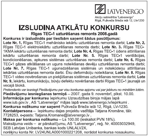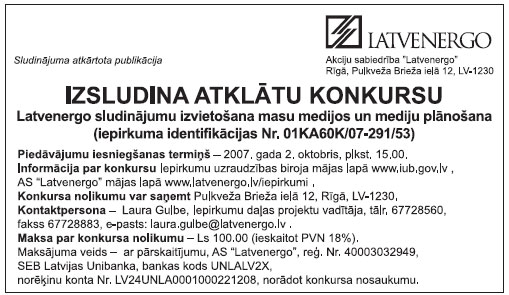 Piedāvājumi noformējami un iesniedzami saskaņā ar konkursa nolikuma noteikumiem iepriekš minētajā adresē līdz 2007. gada 1. oktobrim pulksten 19.