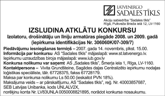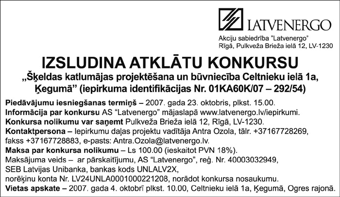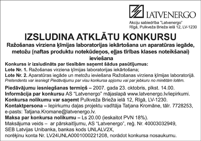 Konkursa piedāvājumu iesniegšanas termiņš ir 2007.gada 2.oktobris pulksten 10.