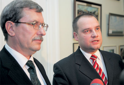 Pēc jaunā Saeimas priekšsēdētāja ievēlēšanas [ar 52 balsīm “par”] (augšējā attēlā no labās): Saeimas priekšsēdētāja biedres Karina Pētersone un Vineta Muižniece, Saeimas priekšsēdētājs Gundars Daudze, Saeimas sekretārs Dzintars Rasnačs, Saeimas sekretāra biedrs Andrejs Klementjevs Pēc Saeimas ārkārtas sēdes, atbildot uz masu mediju jautājumiem (attēlā blakus): bijušais Saeimas priekšsēdētājs Indulis Emsis un jaunievēlētais Saeimas priekšsēdētājs Gundars Daudze