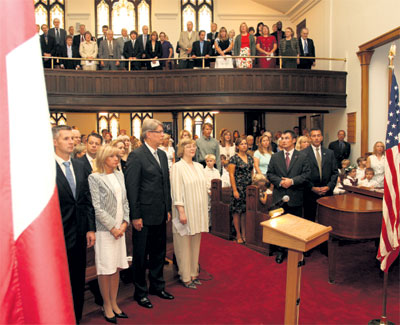 “Man ir patiess prieks uzrunāt jūs šeit, šajā baznīcā. Pirmo reizi es šeit biju tālajā 1991.gadā, dažas dienas pēc šāvieniem Viļņā, kad jūs bijāt sanākuši kopā, lai aizlūgtu par Latvijas valsti. Ir patīkami, ka dažas sejas no tām dienām es redzu arī šodien.