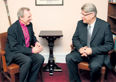 Svētdien, 23.septembrī, Latvijas ārlietu ministrs Artis Pabriks, Lilita Zatlere un Latvijas Valsts prezidents Valdis Zatlers piedalījās svētdienas dievkalpojumā latviešu valodā Ņujorkas Latviešu luterāņu baznīcā (attēlā pa kreisi), Valdis Zatlers tikās ar Latvijas Evaņģēliski luteriskās baznīcas ārpus Latvijas arhibīskapu Elmāru Ernstu Rozīti (augšējā attēlā) un Latvijas pārstāvi ANO Ņujorkā Solveigu Silkalnu Foto: Gatis Bergmanis, VPPD |