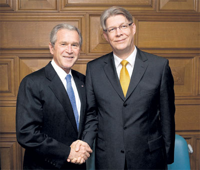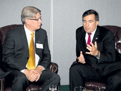 Latvijas Republikas Valsts prezidents Valdis Zatlers, darba vizītes laikā Ņujorkā tiekoties: ar Amerikas Savienoto Valstu prezidentu Džordžu Bušu 25.septembrī (augšējā attēlā), ar Gruzijas Republikas prezidentu Mihailu Saakašvili 25.septembrī (vidējā attēlā) un ar Maķedonijas Republikas prezidentu Branko Crvenkovski 24.septembrī Foto: EPA/A.F.I.; Gatis Bergmanis, VPPD |