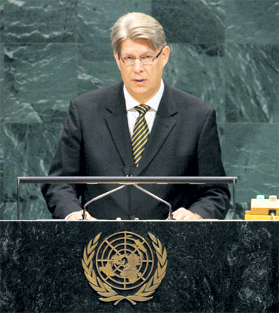 Latvijas Valsts prezidents Valdis Zatlers trešdien, 26.septembrī, Apvienoto Nāciju Organizācijas mītnē Ņujorkā, atklājot ANO Ģenerālās asamblejas 62.sesijas sēdi Foto: EPA/A.F.I. |
