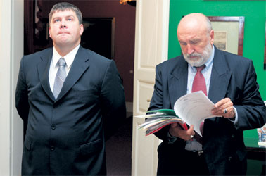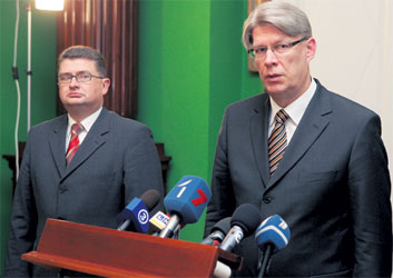 Vakar, 3.oktobra vakarā, pēc Nacionālās drošības padomes sēdes ģenerālprokurors Jānis Maizītis, Valsts prezidents Valdis Zatlers, Ministru prezidents Aigars Kalvītis un iekšlietu ministrs Ivars Godmanis, informējot sabiedrību par organizētās noziedzības apkarošanas situāciju valstī Foto: Māris Kaparkalējs, “LV” |