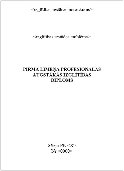 1. Diploma 1. un 2.lappusē teksts ir iespiests un identisks visos pirmā līmeņa profesionālās augstākās izglītības diplomos.