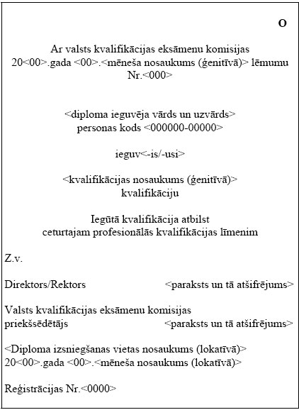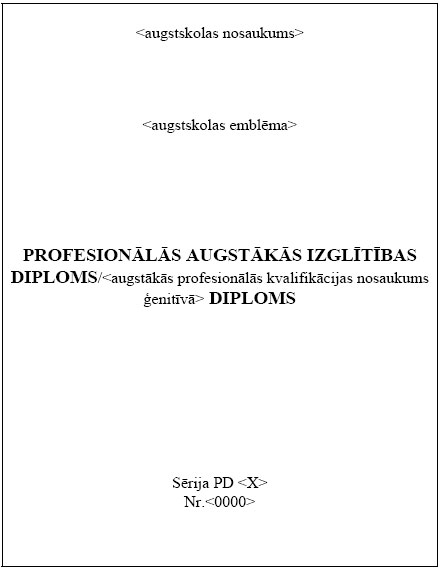 1. Diploma 1. un 2.lappusē teksts ir iespiests un identisks visos profesionālās augstākās izglītības diplomos/<augstākās profesionālās kvalifikācijas nosaukums ģenitīvā> diplomos.