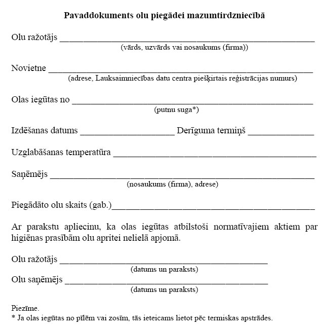 17. Piegādājot olas mazumtirdzniecībai, olu ražotājs tām pievieno aizpildītu pavaddokumentu (pielikums). Pavaddokumentu sagatavo divos eksemplāros. Vienu eksemplāru iesniedz olu piegādes vietā, otru glabā olu ražotājs. Olu ražotājs un komersants, kurš nodarbojas ar mazumtirdzniecību, pavaddokumentu glabā vienu gadu un uzrāda pēc dienesta inspektora pieprasījuma.