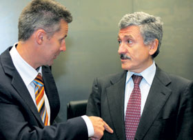 Pirmdien, 15.oktobrī, Luksemburgā Latvijas ārlietu ministrs Artis Pabriks (attēlā pa kreisi) piedalījās Eiropas Savienības Vispārējo lietu un ārējo attiecību padomes sanāksmē, kuras ietvaros aktuālos ārlietu jautājumus apsprieda arī ar savu Itālijas kolēģi Masimo d’Alemu Foto: EPA/A.F.I. |