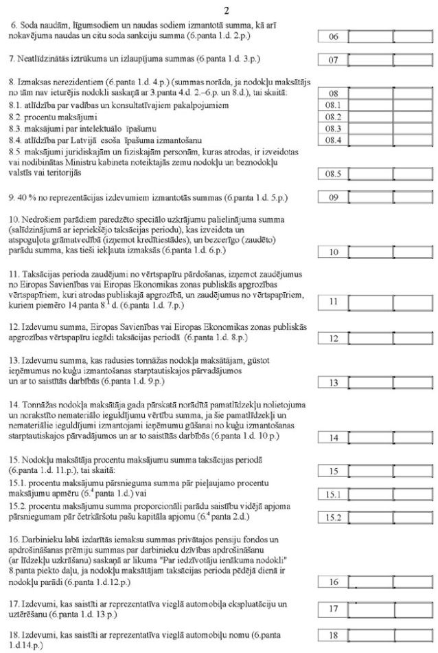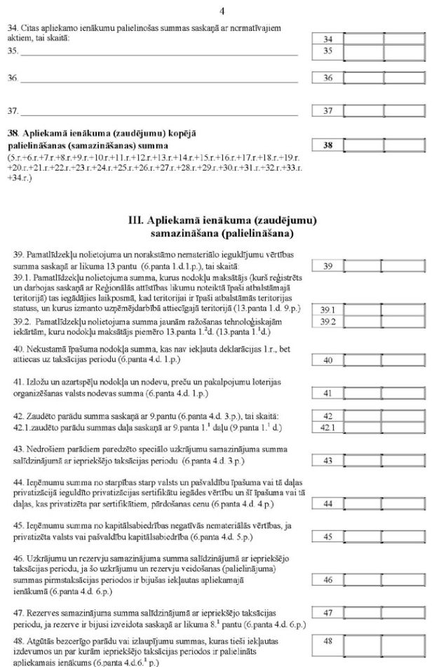 3.6. deklarācijas 34.rindā norāda citas apliekamo ienākumu palielinošas summas saskaņā ar normatīvajiem aktiem, kurus min 35., 36. un 37.rindā (piemēram, ārvalstīs samaksāto ienākuma nodokli, ja šī summa ir ņemta vērā, nosakot maksātāja peļņu vai zaudējumus, vai komersanta pastāvīgās pārstāvniecības (piemēram, Lietuvā) taksācijas perioda izdevumu summas, kuras iekļautas komersanta peļņas vai zaudējumu aprēķinā, ja, nosakot uzņēmumu ienākuma nodokli par taksācijas periodu, tiek piemērota atbrīvošanas metode);