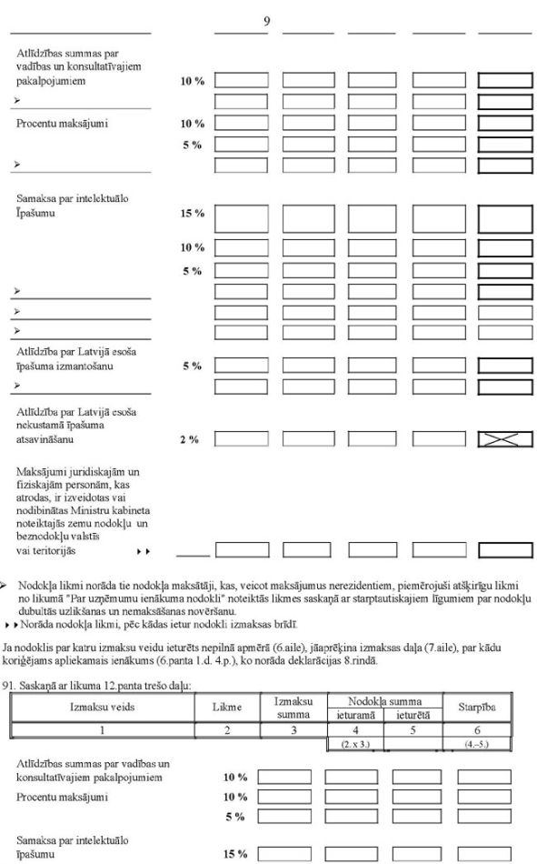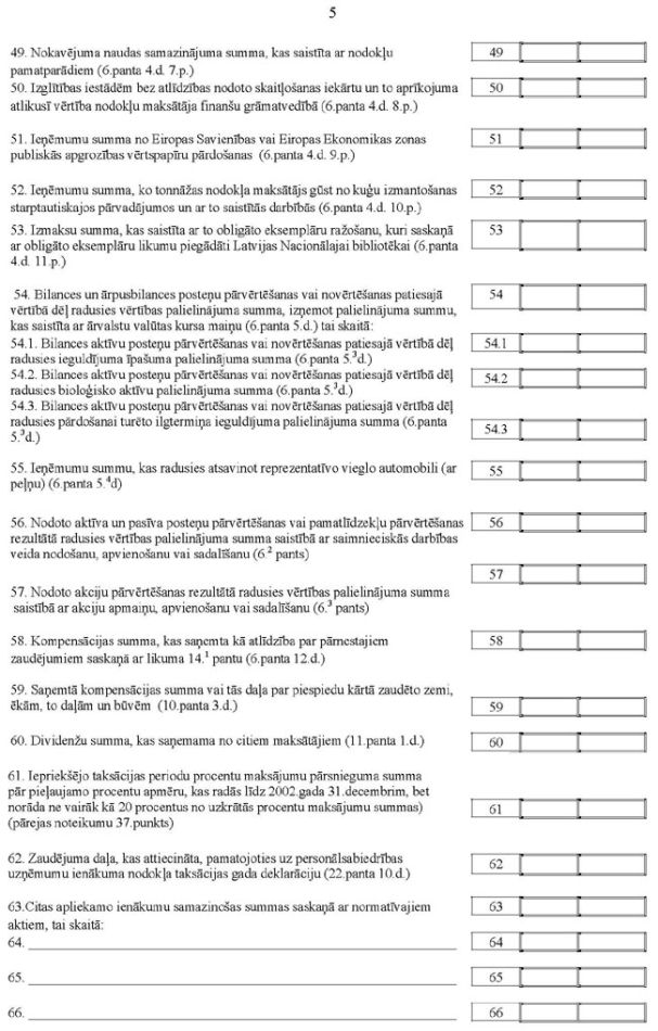 3.7. deklarācijas 63.rindā norāda citas apliekamo ienākumu samazinošas summas saskaņā ar normatīvajiem aktiem, kurus min 64., 65. un 66.rindā. To izmanto, piemēram, samazinot apliekamo ienākumu par komersanta pastāvīgās pārstāvniecības (piemēram, Lietuvā) taksācijas perioda ieņēmumu summām (kuras iekļautas uzņēmuma peļņas vai zaudējumu aprēķinā), ja, nosakot uzņēmumu ienākuma nodokli par taksācijas periodu, tiek piemērota atbrīvošanas metode;