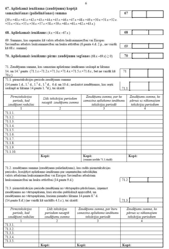 3.12. nodokļu maksātājs, kurš ir uzņēmumu grupas dalībnieks un uz kuru ir pārnesti cita uzņēmumu grupas dalībnieka zaudējumi, deklarācijas 71.6.rindā norāda pārnesto zaudējumu summu, par kuru tas samazina savu taksācijas perioda apliekamo ienākumu;