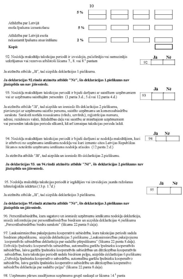 3.14. nodokļa maksātājs, kas likuma "Par uzņēmumu ienākuma nodokli" III nodaļā paredzētās nodokļa atlaides nepiemēro (izņemot atlaidi par ārvalstīs samaksāto nodokli saskaņā ar likuma "Par uzņēmumu ienākuma nodokli" 16.pantu un atlaidi ziedotājiem saskaņā ar likuma "Par uzņēmumu ienākuma nodokli" 20.pantu), jo tas piemēro nodokļa atlaides saskaņā ar citiem Latvijas Republikas likumiem (piemēram, likums "Par nodokļu piemērošanu brīvostās un speciālajās ekonomiskajās zonās"), deklarācijas 79., 80., 81., 82. un 83.rindu neaizpilda, un deklarācijas 78.rindā norādītā nodokļa summa ir vienāda ar deklarācijas 84.rindā norādīto summu.