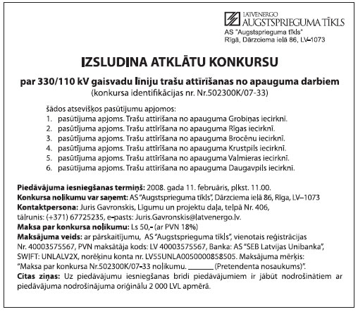 Pretendentiem jāiesniedz piedāvājuma nodrošinājums. Uzziņas pa tālr. 7234525, 7234926.