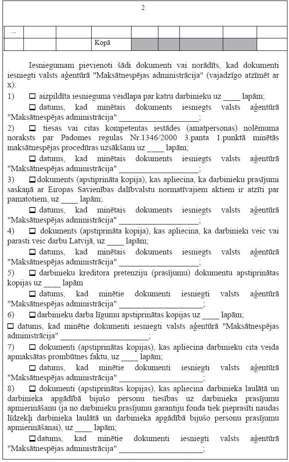 "2. Likvidators, pieprasot no darbinieku prasījumu garantiju fonda naudas līdzekļus darbinieku prasījumu apmierināšanai, kas saistīti ar darba samaksu, apmaksāto atvaļinājumu, cita veida apmaksātu prombūtni, atlaišanas pabalstu un kaitējuma atlīdzību sakarā ar nelaimes gadījumu darbā vai arodslimību, valsts aģentūrā "Maksātnespējas administrācija" (turpmāk - Maksātnespējas administrācija) iesniedz šādus dokumentus (vai norāda, kad dokumenti iesniegti Maksātnespējas administrācijā):