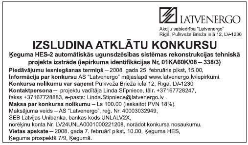 SIA “Liepājas enerģija”, reģ.nr. 42103035386, izsludina atklātu konkursu “Ūdenssildāmā katla ar jaudu 20MW piegāde un būvmontāža”.