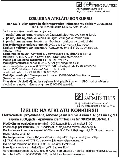 Konkursa piedāvājumu atvēršana notiks 2008.gada 11.februārī pulksten 10.40 Rīgā, Gogoļa ielā 3, 227.kabinetā.
