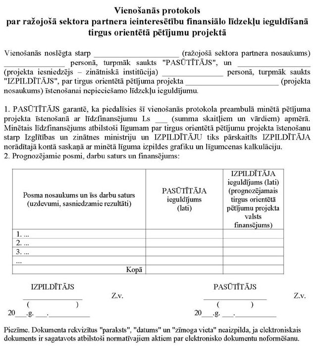 16. Iesniegumu (1.pielikums) iesniedz ministrijā trijos eksemplāros papīra formā un elektroniski (datu nesējā). Iesniegumus publicē vismaz vienā dienas laikrakstā, kas tiek izplatīts visā Latvijas teritorijā, un ievieto ministrijas mājaslapā internetā. Iesniegumam pievieno abpusēji parakstītu vienošanās protokolu par ražojošā sektora partnera apņemšanos ieguldīt projektā līdzekļus (2.pielikums).