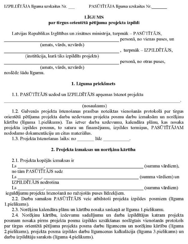 44. Pamatojoties uz komisijas lēmumu par projekta finansēšanu, ministrija (pasūtītājs) slēdz līgumu ar projekta iesniedzēju (izpildītāju) par projekta izpildi (7.pielikums). Līgumu trijos eksemplāros sagatavo projekta iesniedzējs.