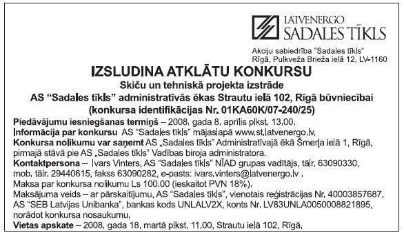 Konkursa nolikumu var saņemt Tehniskās vadības direkcijā Rīgā, Gogoļa ielā 3, 367.telpā, tālr. 67233846, 67234526, 67234070.