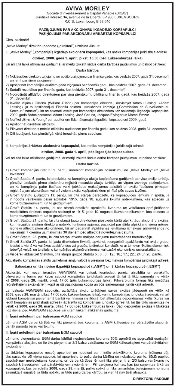 Akcionāri var iepazīties ar lēmumu projektiem sapulces darba kārtībā iekļautajos jautājumos no 2008.gada 11.aprīļa līdz 24.aprīlim katru darbdienu laikā no pulksten 9 līdz 16 “Kalnabeitēs” 8, Siguldas pagastā.