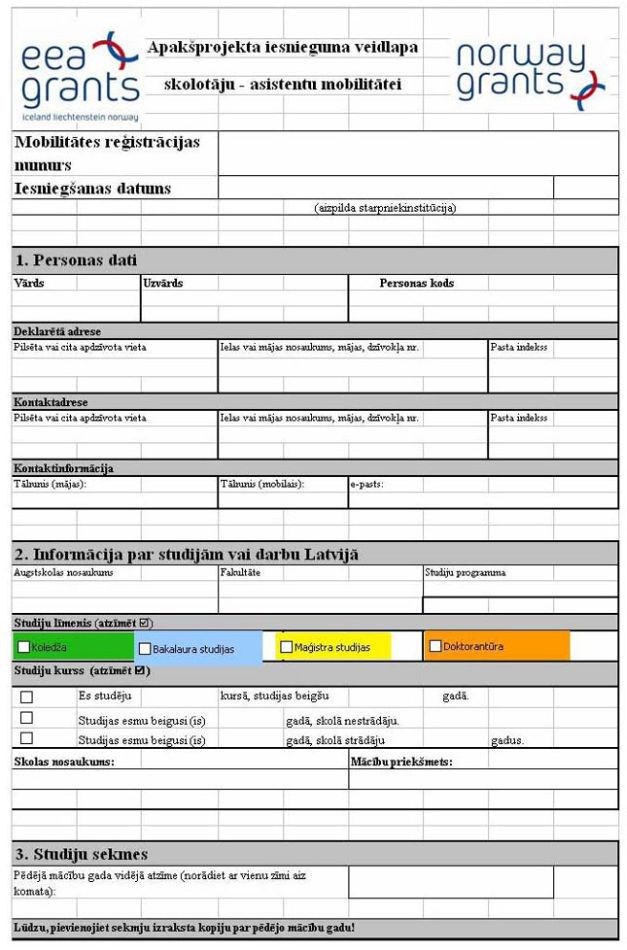 Apakšprojekta iesnieguma veidlapu parakstījis apakšprojekta iesnieguma iesniedzējs, kā arī apakšprojekta iesnieguma iesniedzēja mājas augstskolas studiju programmas vadītājs vai darba devējs (skolas direktors) |