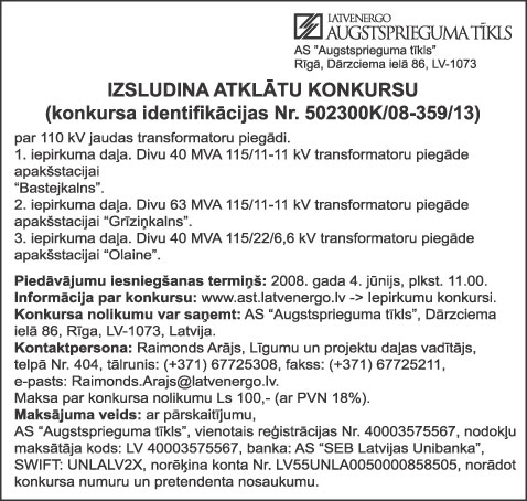 Piedāvājuma iesniegšanas termiņš – 2008.gada 16.aprīlis plkst. 10.00.