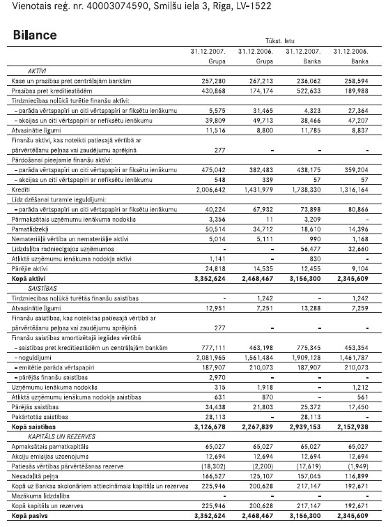 Aktīvu un saistību pārskats (Ls) uz 31.12.2007