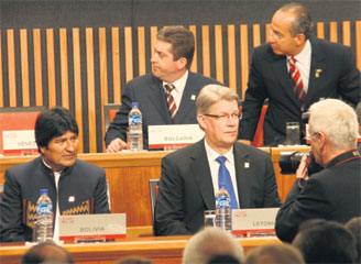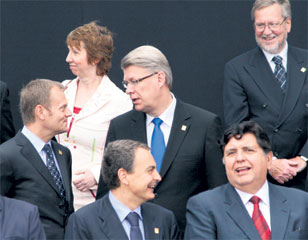 Attēlā pa kreisi: Latvijas Valsts prezidents Valdis Zatlers 16.maijā Peru galvaspilsētā Limā, piedaloties piektajā Eiropas Savienības–Latīņamerikas valstu un valdību vadītāju samitā. Attēlā pa labi: Valdis Zatlers (otrajā rindā centrā) kopā ar samita dalībniekiem – Polijas premjerministru Donaldu Tusku (otrajā rindā pa kreisi), Peru prezidentu Alanu Garsiju Peresu (pirmajā rindā pa labi), Spānijas premjerministru Hosē Luisu Rodrigesu Sapatero (pirmajā rindā pa kreisi) |