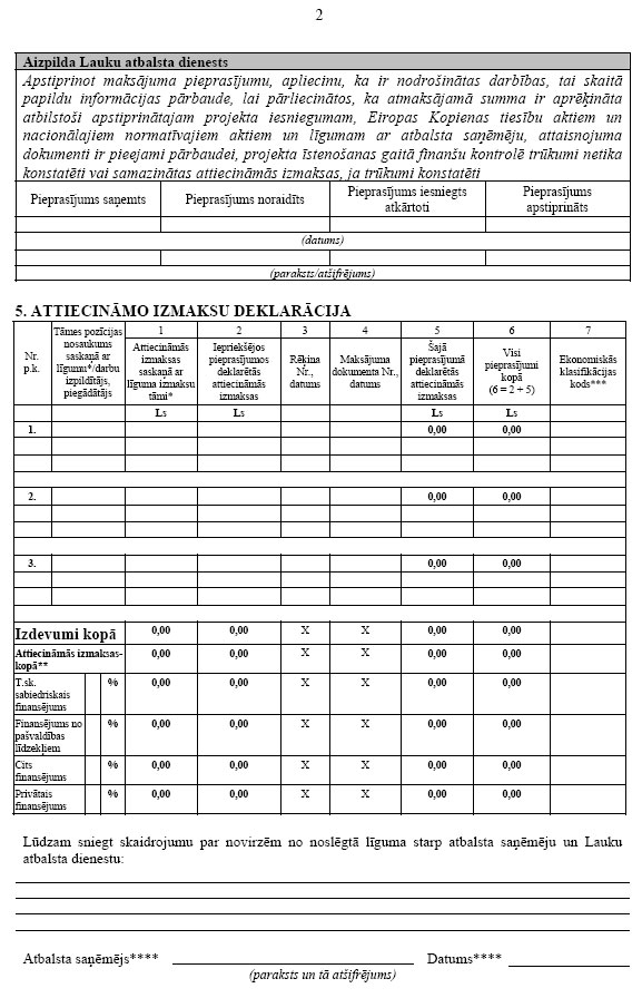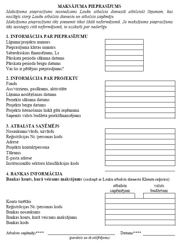 45. Pēc projekta īstenošanas atbalsta saņēmējs iesniedz Lauku atbalsta dienestā maksājuma pieprasījumu (2.pielikums). Lauku atbalsta dienestā atbalsta saņēmējam izmaksājamo publiskā finansējuma apjomu nosaka, pamatojoties uz līguma izmaksu tāmi un šo noteikumu 18.punktā minētajiem dokumentiem.