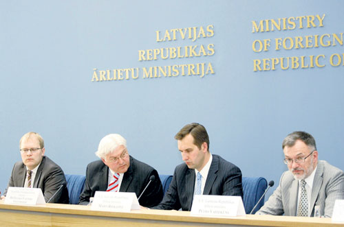 Igaunijas ārlietu ministra Urmasa Paetsa, Vācijas ārlietu ministra Franka Valtera Šteinmeijera, Latvijas ārlietu ministra Māra Riekstiņa un Lietuvas ārlietu ministra Petra Vaitiekūna preses konferencē 20.maijā: