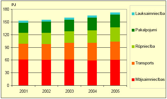 Enerģijas gala patēriņš Latvijas Republikā 2005.gadā bija 172 PJ. Lielākie enerģijas patērētāji bija mājsaimniecības un transports (1.att.) – attiecīgi 36 % un 25 %.