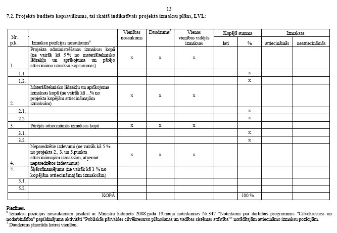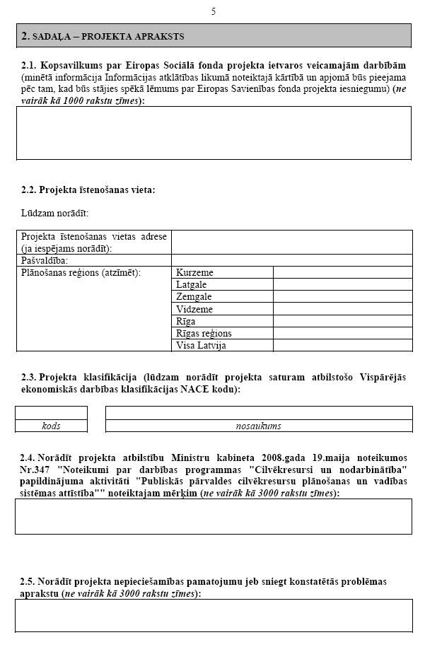 Projekta iesniegums ir sagatavots atbilstoši Ministru kabineta 2008.gada 19.maija noteikumos Nr.347 “Noteikumi par darbības programmas “Cilvēkresursi un nodarbinātība” papildinājuma aktivitāti “Publiskās pārvaldes cilvēkresursu plānošanas un vadības sistēmas attīstība”” noteiktajai projekta iesnieguma veidlapai |