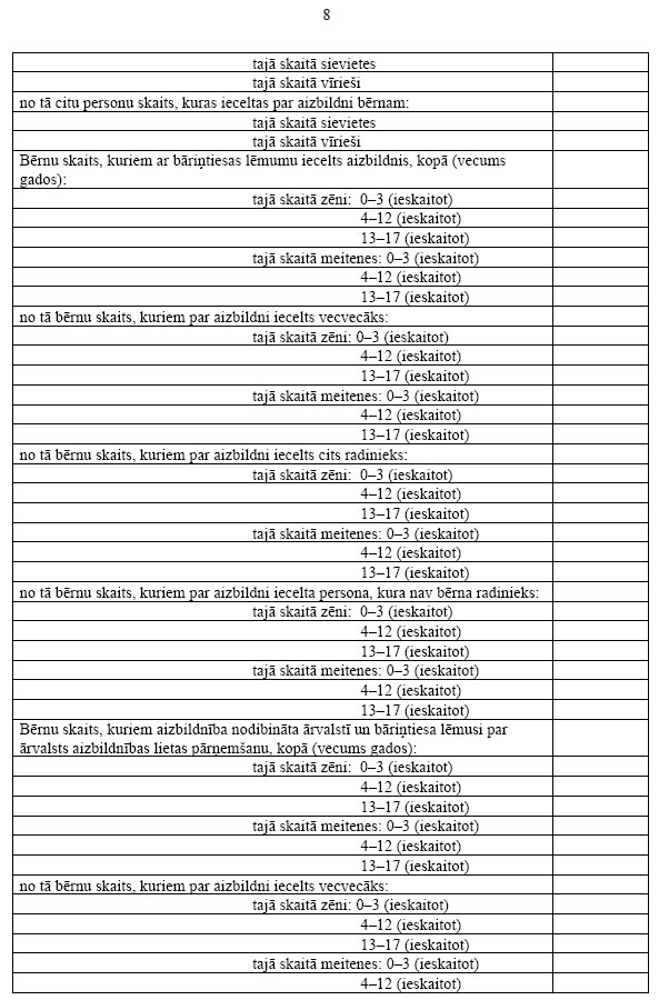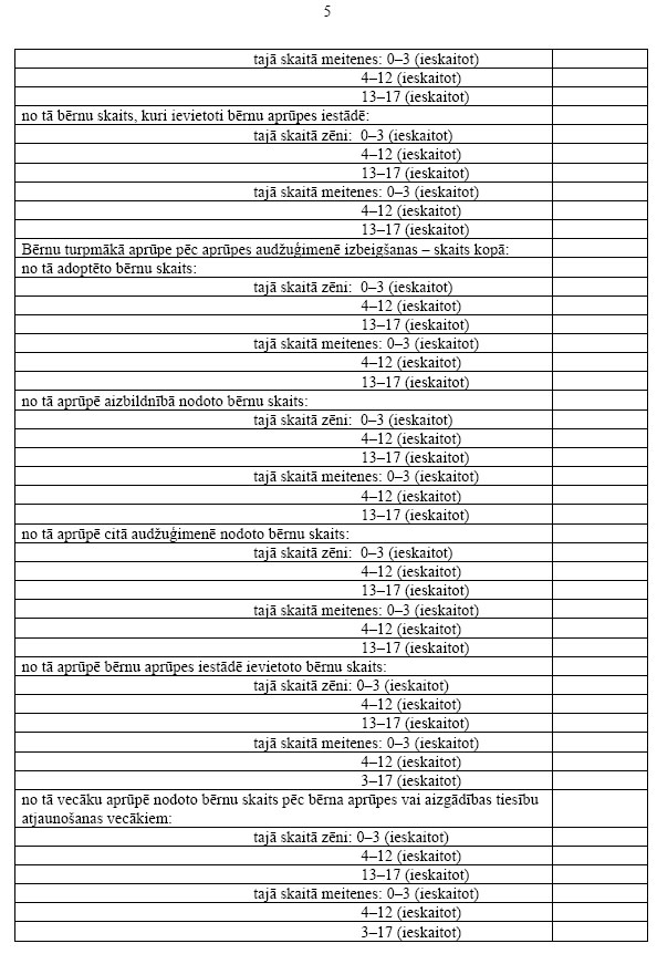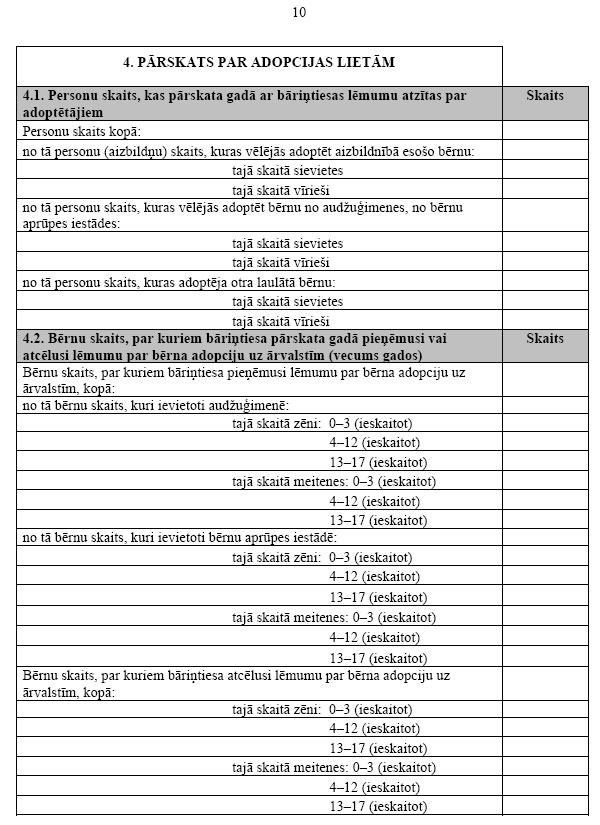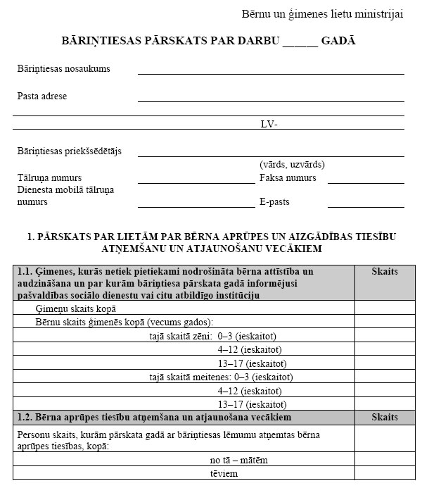 2. Bāriņtiesa apkopo veidlapas paraugā norādīto informāciju, pamatojoties uz pārskata gadā izskatītajām lietām un pieņemtajiem lēmumiem, aizpilda veidlapu un līdz kārtējā gada 1.februārim iesniedz to Bērnu un ģimenes lietu ministrijā.
