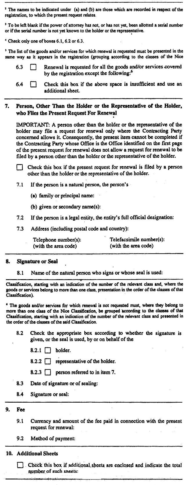 (vii) where the Contracting Party allows the renewal of a registration to be made for some only of the goods and/or services which are recorded in the register of marks and such a renewal is requested, the names of the recorded goods and/or services for which the renewal is requested or the names of the recorded goods and/or services for which the renewal is not requested, grouped according to the classes of the Nice Classification, each group preceded by the number of the class of that Classification to which that group of goods or services belongs and presented in the order of the classes of the said Classification;
