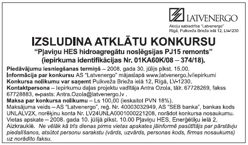 Piegādes un darbu izpildes pasūtījumi. Publicēts oficiālajā laikrakstā "Latvijas Vēstnesis", 2.07.2008., Nr. 100 https://www.vestnesis.lv/ta/id/177470