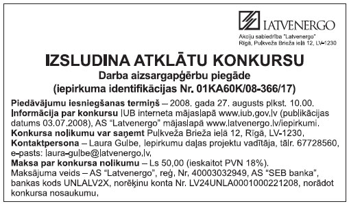 Ozolnieku novada dome, Stadiona iela 10, Ozolnieki, Jelgavas rajons, izsludina koncesijas piešķiršanas konkursu par Ozolnieku novada Ānes un Teteles ciemu dzīvojamo namu un komunāltehnisko objektu nodošanu koncesijā, kā arī par tiesībām sniegt komunālos pakalpojumus un veikt dzīvojamo namu apsaimniekošanu Ozolnieku novada Ānes un Teteles ciemos. Par uzvarētāju tiks atzīts visām kvalifikācijas prasībām atbilstošs pretendents, kas būs iesniedzis visizdevīgāko piedāvājumu, atbilstoši konkursa nolikuma prasībām. Pretendentam nepieciešama pieredze komunāltehnisko objektu darbības nodrošināšanā un dzīvojamo māju apsaimniekošanā, kā arī jāiztur konkursa nolikumā noteiktās kvalifikācijas pārbaudes prasības. Iepazīties un saņemt konkursa nolikumu var, sākot ar 2008.gada 27.jūniju katru darba dienu no plkst. 8 līdz plkst.13 Ozolnieku novada domē Stadiona ielā 10, Ozolniekos, Jelgavas rajonā, 2.stāvā, pie sekretāres, uzrādot maksājuma uzdevumu par Ls 10 (desmit latu) samaksu Ozolnieku novada domes kasē vai a/s “Hansabanka” kontā nr. LV72HABA0551001405027. Pretendentiem savi piedāvājumi jāiesniedz Ozolnieku novada domē 2.kabinetā līdz 2008.gada 14.augustam plkst.10.