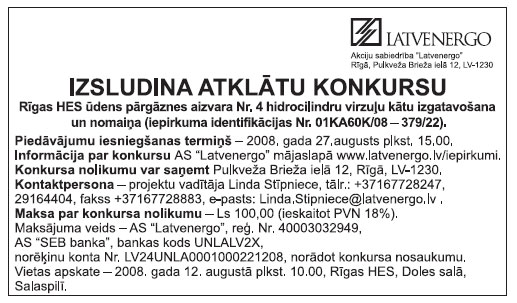 Piedāvājumu iesniegšanas termiņš 2008.gada 12.augusts pulksten 12.